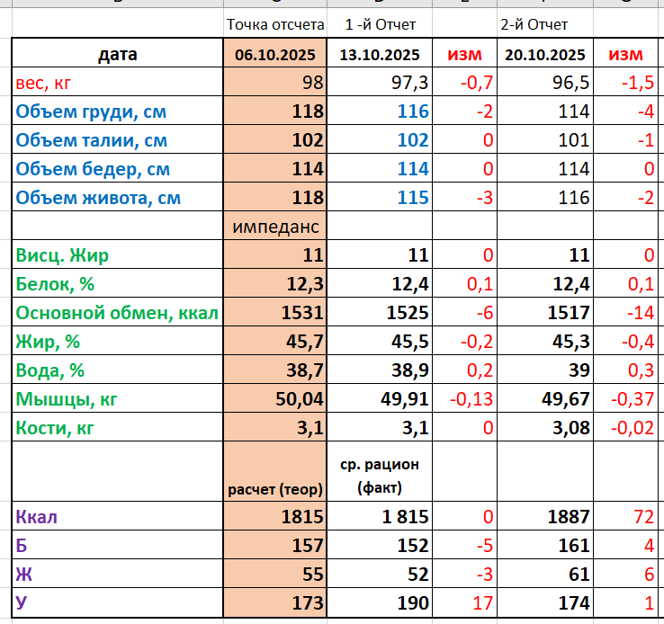 📌Выводы ✔Темпы потери жировой массы остались стабильными или даже немного ускорились. *Расчёт жировой массы: Таким образом, потеря жира за вторую неделю была чуть выше, несмотря на небольшой избыток калорий (+72 ккал в день). ✔Увеличение NEAT (шаги + 4 часа уборки) на 2-й неделе компенсировало избыток калорий. ✔Состав тела: 📍Потеря мышечной массы при достаточном количестве белка и силовых нагрузках вызывает вопросы. Требуется: контроль гидратации перед измерениями. Проверка данных импеданса (например, с помощью фотографий/объёмов). Даже при строгом контроле калорий и высоких силовых нагрузках биоимпедансометрия может показывать ложное снижение мышечной массы из-за колебаний уровня воды в организме. 📍Отсутствие динамики в отношен
