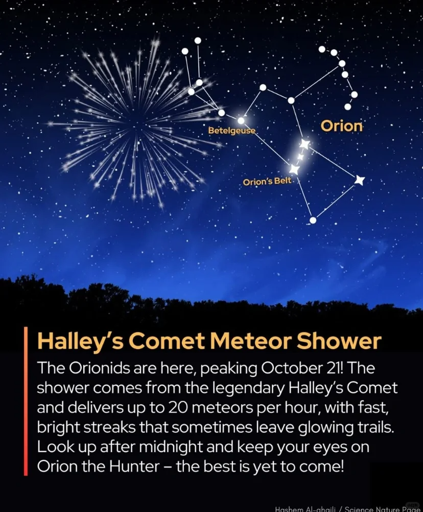 Знаменитый метеорный поток Ориониды достигнет своего пика в ночь с 21 на 22 октября 2025 года! Ожидается, что это ежегодное зрелище, вызванное фрагментами, оставленными на орбите знаменитой кометы, достигнет своего пика до рассвета 22-го числа. В час возможно появление около 20 метеоров. Метеорный поток Ориониды известен большим количеством быстро движущихся ярких метеоров, часто оставляющих за собой длинные яркие следы, которые выглядят поистине впечатляюще. Найдите тихое место вдали от городских огней и спокойно посмотрите на юго-восточное небо, чтобы запечатлеть эту космическую романтику.