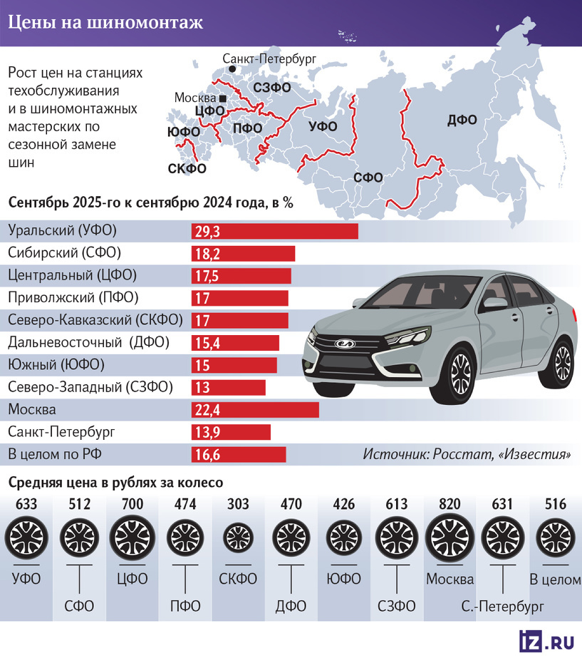 Уральский федеральный округ (УрФО) оказался лидером среди российских регионв по росту цен на шиномонтаж. Мастера просят 633 рубля за колесо, это на 29,3% больше, чем год назад. Об этом говорится в данных Росстата. В Москве услуга стоит в среднем 820 рублей (3280 рублей за четыре колеса) — на 22,4% дороже, а в Санкт-Петербурге — 631 рубль (2524 рубля, +13,9%). В Сибирском федеральном округе средняя стоимость поднялась на 18,2%, (до 512 рублей за колесо), в Центральном федеральном округе — на 17,5% (до 700 рублей), в Приволжском и Северо-Кавказском — на 17% (до 474 и 303 рублей соответственно). Меньшая динамика роста на Дальнем Востоке, где установка зимних шин обойдется в 470 рублей за колесо — на 15,4% больше, в Южном федеральном округе — в 426 рублей (+15%), в Северо-Западном — в 613 рублей (+13%). Больше всего поднимают цены небольшие мастерские. Там это объясняют тем, что готовятся за осенний наплыв клиентов покрыть убытки прошлых месяцев. Крупные игроки стараются удерживать стоимос