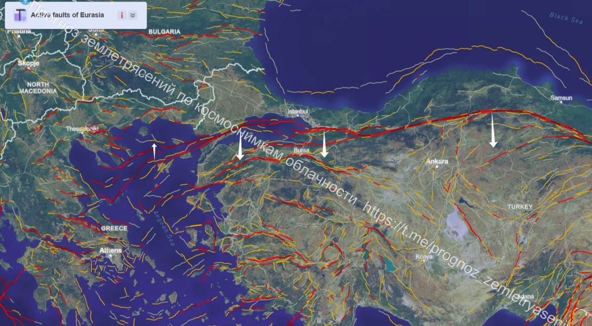 В ответ на пост Сегодня в верхнем слое облачности вновь трассируется северо-западная граница Анатолийской плиты. Протяженность ОСТИ снова тянет на сейсмическое событие М6+ ===== Today, the northwestern boundary of the Anatolian Plate is again traced in the upper cloud layer. The length of the CSTI is again drawn to the seismic event M6+
