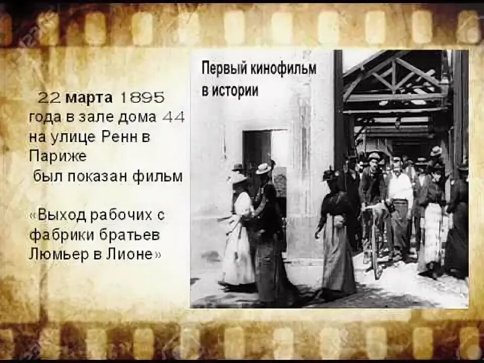- 1. Первым фильмом в истории считается "Выход рабочих с фабрики" братьев Люмьер, снятый в 1895 году. Он длился всего 46 секунд, но положил начало целой индустрии.