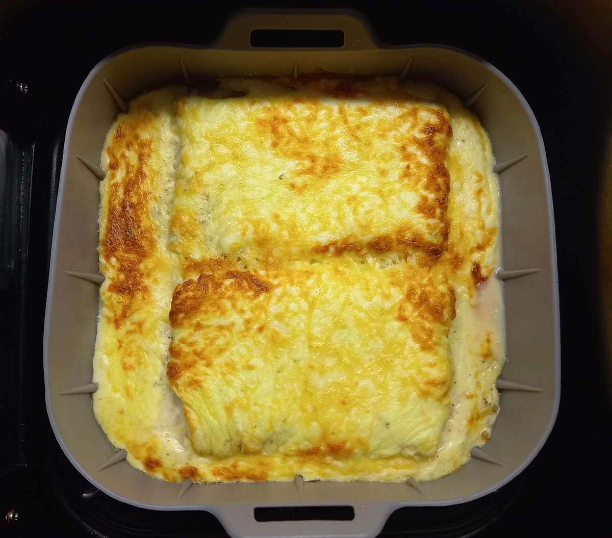 30гр твердого сыра Начинаем с самой рыбы. Замороженные брикеты кладем в форму для запекания. (Рецепт в папочке "АЭРОГРИЛЬ" поэтому ориентируюсь на него, но все, что делается в нем, легко переносится и на духовку) Я не размораживаю рыбу, так проще с ней работать. Солим, перчим по вкусу. Далее готовим ту самую "шубку", что сделает минтай просто волшебным! В сметану вводим яйцо, натертый на мелкой терке чеснок и все хорошо перемешиваем. Заливаем этим соусом рыбу, сверху трем на мелкой терке сыр. Отправляем запекаться на 30 минут при 180 градусах. В некотор