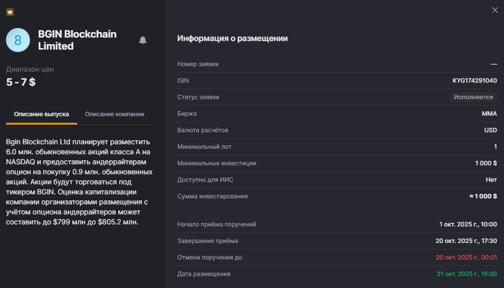 В ответ на пост $BGIN #IPO Подаю заявку на участие в IPO. Сегодня крайний срок до 17:30. Бумага должна начать торговаться завтра после 19:00. Буду подавать с двух счетов. На одном 1000$, на втором (который будет идти в отслеживание - на 5000$ Скрин второй заявки позже закину. Там мне надо продать пока позицию.