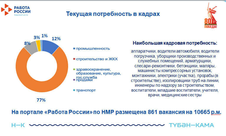 Автор: Эльза Кузнецова На деловом понедельнике начальник Центра занятости населения Нижнекамска Ирина Герасименкова рассказала о текущей ситуации на рынке труда и перспективах кадрового обеспечения региона. По ее словам, работодатели на портале «Работа России» предлагают 47,5 тысячи вакансий по всей республике, из которых 861 вакансия приходится на Нижнекамск и Нижнекамский район, что соответствует 10 665 рабочим местам. «Наибольший спрос на кадры сохраняется в строительстве и ЖКХ – это почти 77% всех вакансий в районе, или 8 196 рабочих мест. Следующими по востребованности идут промышленность – 1 226 мест, и сферы образования, здравоохранения, науки и культуры – 887 мест», – отметила Герасименкова. Меньше всего вакансий открыто в продажах и бытовом обслуживании (294 места) и транспорте (62 места). Среди наиболее востребованных специальностей она выделила работников производственных и сервисных профессий: аппаратчиков, водителей автомобилей и погрузчиков, уборщиков, арматурщиков, слеса