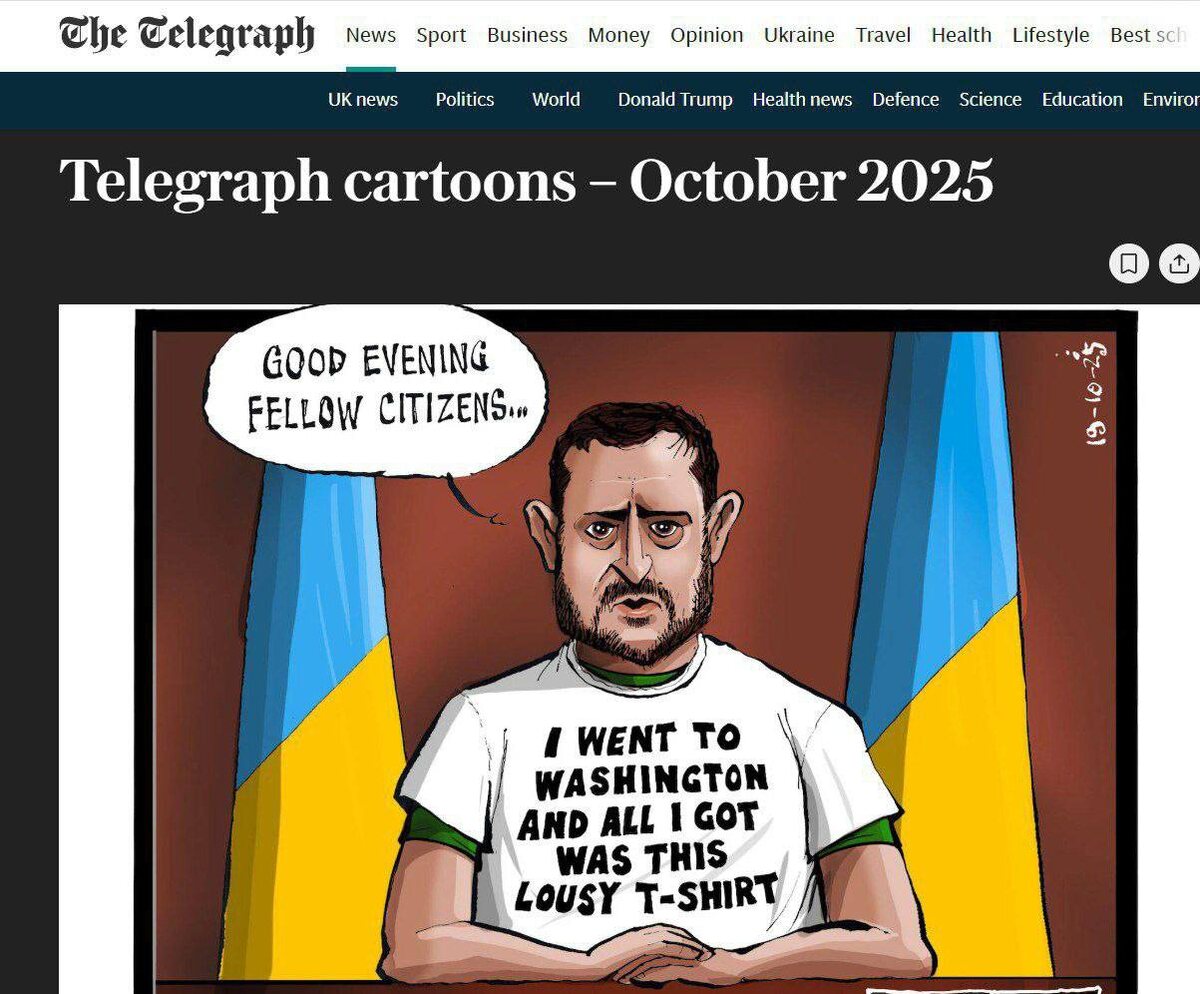 «Я поехал в Вашингтон, и всё, что я получил, - эту паршивую футболку». Британская The Telegraph опубликовала карикатуру с Зеленским в белой футболке. ✍️ НАСОНОВ 🔴
