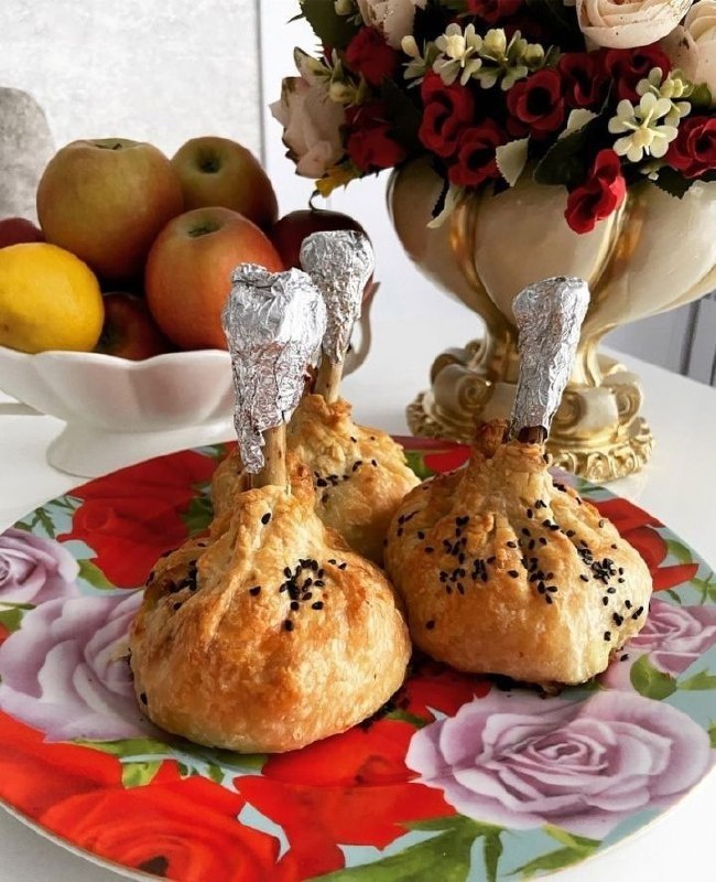 Раилә Ахуновадан бик тәмле рецепт. Кирәк була: Тавык боты (голень) 4-5 шт бәрәңге, Слоеный камыр (без дрожжей минеке) Гөмбә белән суган тушит итеп салырга була, сыр һәм сметан белән Эш барышы: тавык ботын тоз, борыч, приправа для курицы, сарымсак, соевый соус белән маринад ясап болгатып куябыз, 30-40 минуттан кыздырып алабыз (духовкага куеп алсан да була). Пешкәч, суытып сөяктән итне арындырабыз. Бәрәңгене әрчеп, суда пешереп сөт, май салып төябез. Камырны бераз җәеп 6 кисәккә шакмаклап бүлеп, башта бәрәңге өстенә ит, гөмбә салабыз һәм сөякне чистартып башыннан фольга чорнап начинка уртасын утыртып куеп камырны җыябыз, йомырка яки сөт белән майлап кунжут сибеп җибәрәбез, 180-170 градуслы мичтә 35-40 минут пешерәбез. Тәмле булсын!