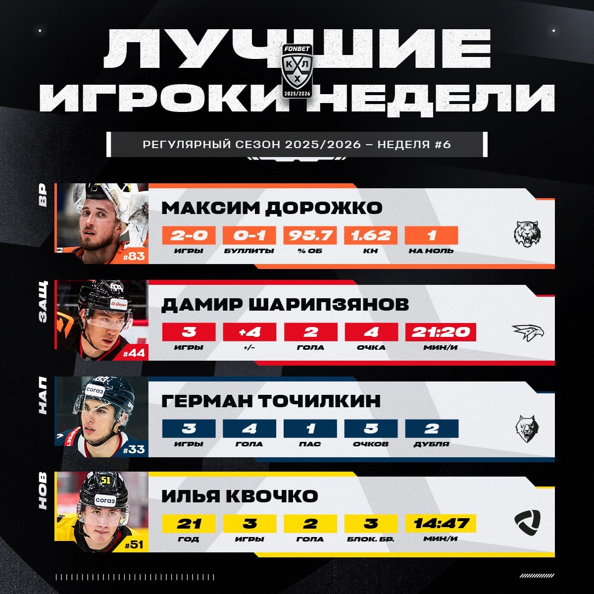 КХЛ представляет лучших игроков 6-й недели сезона 2025/2026.