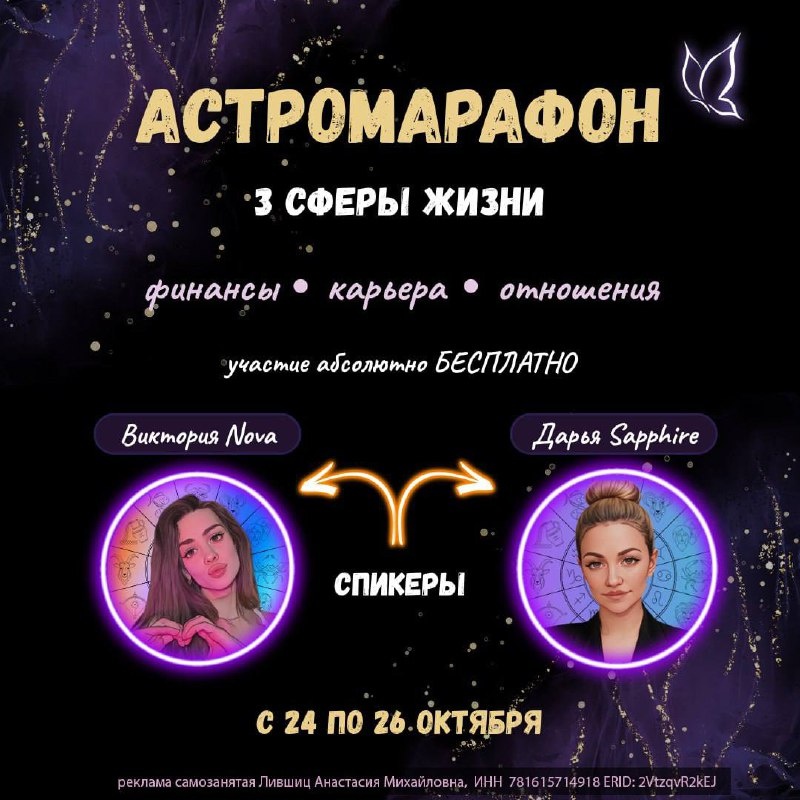 Ты давно хотел наладить вопрос финансов, отношений и реализации? Тогда этот марафон точно ДЛЯ ТЕБЯ! С 24 по 26 октября пройдет марафон по ведической астрологии Джйотиш «3 сферы жизни», где ты: ✅ определишь свой психотип личности, сильные стороны и ресурсы ✅ узнаешь, как тебе найти гармоничные отношения ✅ поймешь, в какой сфере твоя реализация ✅ рассчитаешь, где твои основные источники финансов, а где они утекают Формат: онлайн Спикеры: дипломированные ведические астрологи, Виктория NOVA и Дарья Sapphire Участие абсолютно БЕСПЛАТНО! 🎁Для всех участников марафона будет много подарков и инсайтов. Первый из них ты можешь получить уже в закрепе закрытого канала марафона. Не пропусти, если давно хочешь позитивных изменений в своей жизни! Вступай в закрытый чат марафона и твоя трансформация начнется уже сейчас! Плохого не посоветую, так что идите )