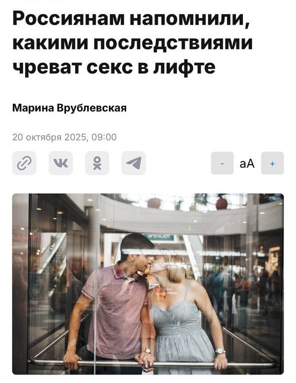 Секс в лифте может привести к аресту на 15 суток Юристы предупреждают, что секс в лифте расценивается как мелкое хулиганство в общественном месте. За это предусмотрен штраф до 1500 рублей или арест. ────────── ⚡️Важные новости – без лишнего шума!⚡️ Подпишись на канал и получай только суть: оперативно, чётко, по делу! 👉 ИнфоСплетник | @infospletnik