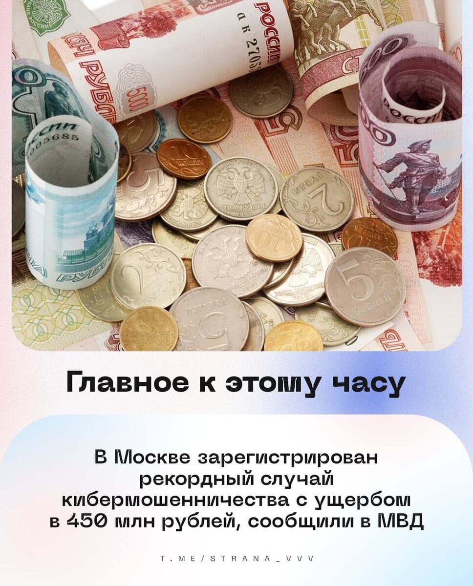 🇷🇺🇷🇺🇷🇺🇷🇺🇷🇺🇷🇺 на утро 20 октября: 🔹В Москве зарегистрирован рекордный случай кибермошенничества с ущербом в 450 млн рублей, сообщили в МВД. 🔹Российские силы ПВО за ночь сбили семь украинских беспилотников — Минобороны. 🔹МВД вновь объявило в розыск бросившего в сугроб младенца блогера Косенко, заочно арестованного по двум статьям УК РФ. 🔹Министр обороны Белоусов поздравил российских военных связистов с профессиональным праздником. 🔹Цитаты Жириновского появятся на российских улицах в честь 80-летия со дня его рождения, сообщил Леонид Слуцкий. 🔹Москвича оштрафовали за посты в «ВКонтакте» с пропагандой запрещенного в РФ движения ЛГБТ на 224 тыс. рублей. 💰Курсы валют: доллар — 📈 80,98; евро — 📈94,58; юань — 📈11,34. 🇷🇺 В Стране. Подписаться