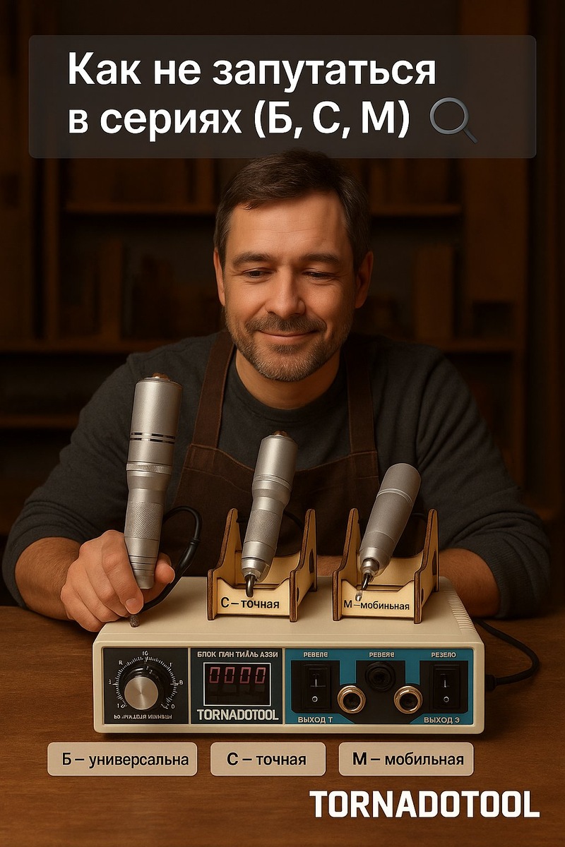 Как не запутаться в сериях Tornadotool 🔍 Tornadotool выпускает три серии граверов — каждая со своей задачей: 🔹 Серия Б (Б8 / Б9) — универсальная — Подходит для дерева, пластика, кости. — Идеальный баланс мощности и контроля. — До 12 000 об/мин, комфортная работа по 30 минут без перерыва. 🔹 Серия С (С4) — точная — Минимальное биение (до 150 мкн). — Идеальна для гравировки металла, ювелирки и миниатюр. 🔹 Серия М (М4 ) — мобильная — Компактная, лёгкая, для выездной и финишной работы. — Работает от блока или аккумулятора. 💡 Выбирай по задаче — Tornadotool решит любую.