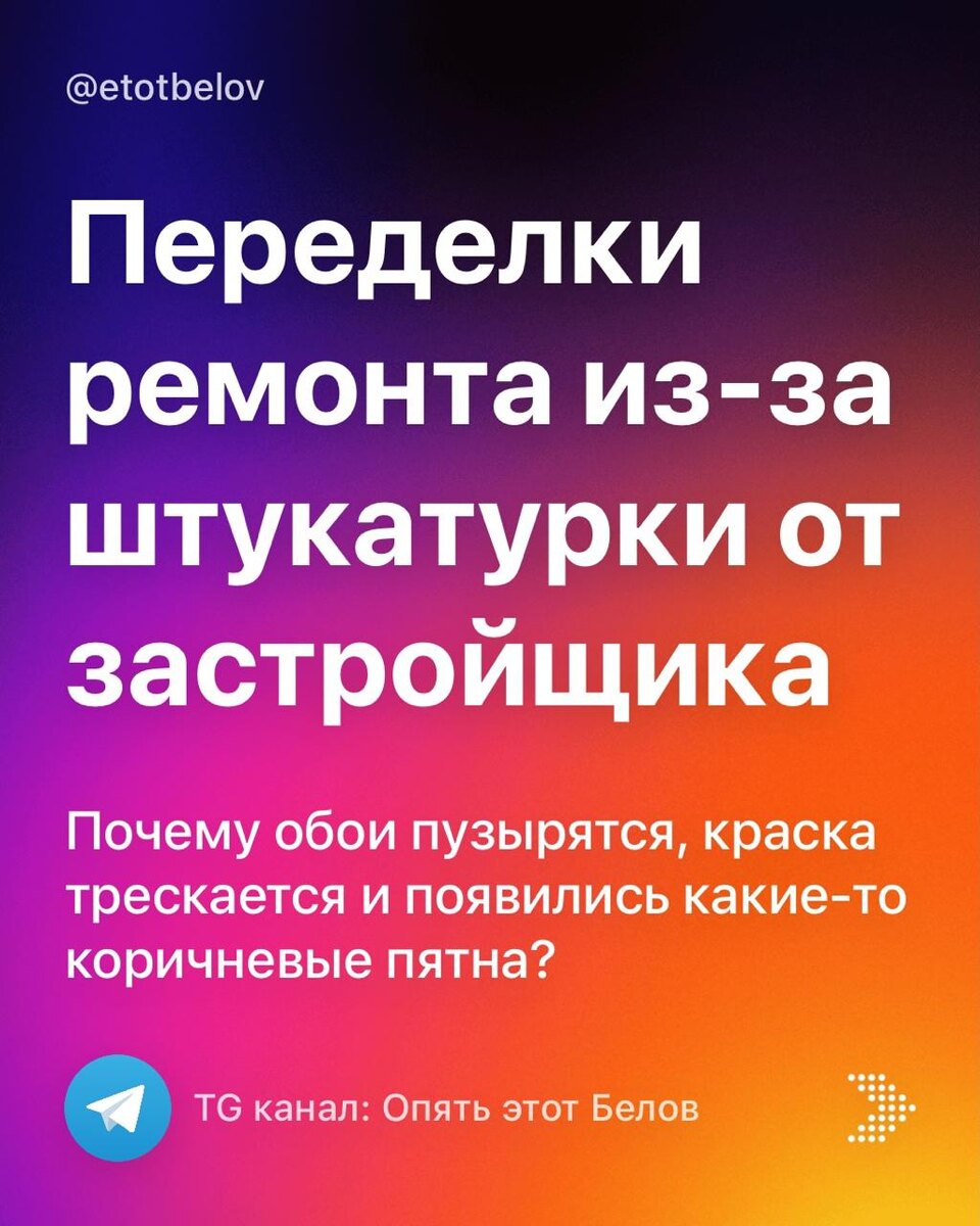 Переделки ремонта из-за штукатурки от застройщика В прошлом посте рассказал об удорожании ремонта из-за штукатурки от застройщика. Там проблема вылазит быстро, сразу во время ремонта и её достаточно просто, хоть и не дешево, исправить. Но есть еще 2 дефекта, которые рано или поздно дадут о себе знать во время проживания в квартире. И вот их уже так просто не исправишь, придется разбирать отделку. 1. Отслоения штукатурки. Частенько слышу от застройщиков, что это ерунда, маленький участок, это такая конструкция, инженерка проходит и это вообще ни на что не повлияет. Ага, как же, еще как повлияет. Для начала нормативная база: ГОСТ 33083-2014, п. 4.6.3 и ГОСТ 58279-2018, п. 4.6.3: «Прочность сцепления затвердевшего штукатурного раствора с основанием должна быть не менее 0,3 МПа» Если там пустота, то сцепления там в принципе никакого нет. А вот последствия уже будет видно невооружённым взглядом: • - пузыри на обоях • - разрывы обоев • - трещины на краске Дело в том, что осадка дома (