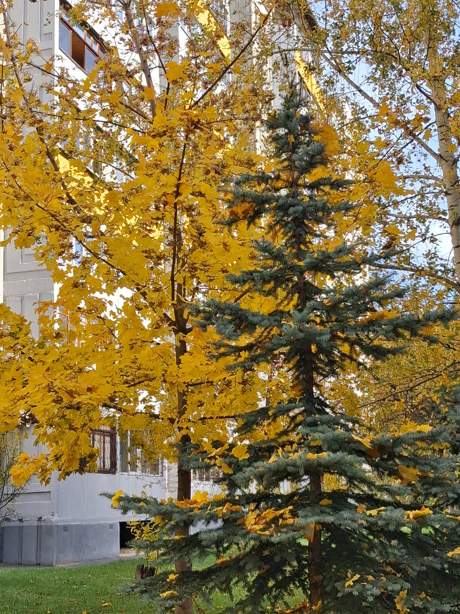 Недавно шла домой и посмотрела на клён, растущий возле тропинки. Он обычно осенью настолько великолепен в своем ярко-жёлтом убранстве, что глаз отвести невозможно. И увидела, что соседняя с ним голубая ель вся наряжена его опавшей листвой, будто гирляндами.