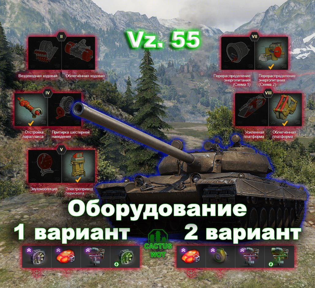 🇨🇿 Vz. 55 🉑Тяжелый танк прорыва 10 уровень. ⛏Оборудование и полевая модернизация на картинке 🔼 ➕Плюсы танка урон с барабана; хорошая стабилизация; есть выбор между двумя пушками. ➖Минусы танка малый запас прочности Нужно больше инфы? ⬇️⬇️⬇️⬇️⬇️⬇️⬇️⬇️⬇️ #базазнаний@CactusWOT #VZ55@CactusWOT #миртанков