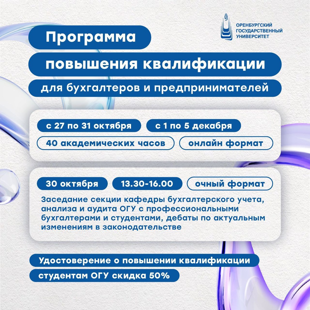 Инвестируй в знания 🙋♂️ Совсем скоро в Оренбургском госуниверситете стартует программа повышения квалификации для бухгалтеров и предпринимателей. Обучение продлится 40 академических часов в онлайн формате. Для студентов ОГУ действует скидка 50%. Ознакомится с темами вебинаров ты можешь на наших карточках. По итогам повышении квалификации все участники получат удостоверение установленного образца ОГУ 👀 Помимо основного обучения слушатели смогут посетить заседание секции кафедры бухгалтерского учета, анализа и аудита ОГУ, а также дебаты по актуальным изменениям в законодательстве. Встречи пройдут в рамках Международной научно-практической конференции «Развитие и взаимодействие реального и финансового секторов экономики в условиях цифровой трансформации». 📎 Для записи на курс необходимо выбрать из списка программу 1.2 📲 Все вопросы по телефону: +7 (3532) 37-59-47 #ОГУ #в_ОГУ #OSU #ОГУполезное