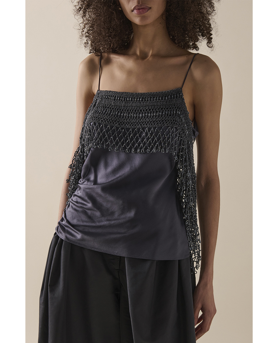 Продолжаем рассматривать новых дизайнеров, которые показывают работы крючком. Один из них австралиец Christopher Esber, про него я никогда не писала, особо не было повода. Бренд Christopher Esber не старожил, но уже и не новичок (основан в 2010 году) и его особенность в струящихся силуэтах и драпировках, женственно, только, на мой взгляд, все-таки на любителя. В зимней коллекции 2025 года появилось очень много интересных моделей. У этих изделий есть особый вектор – узор один, но преподнесение разное (вставка, сочетание с тканью и тп.), при этом рисунок совсем не сложный, его осилит даже новичок – столбики с большим количеством накидов и воздушные петли. Каждый наряд получается струящимся из-за материала – вискозы, а вот стоимость меня удивила от 2000 до 5000 долларов, у многих дизайнеров по такой цене можно найти шелковые изделия. Предлагаю вместе посмотреть и оценить модели этого дизайнера. Классический бельевой топ на тонких бретелях с каймой, выполненной крючком. Фишка модели в двой