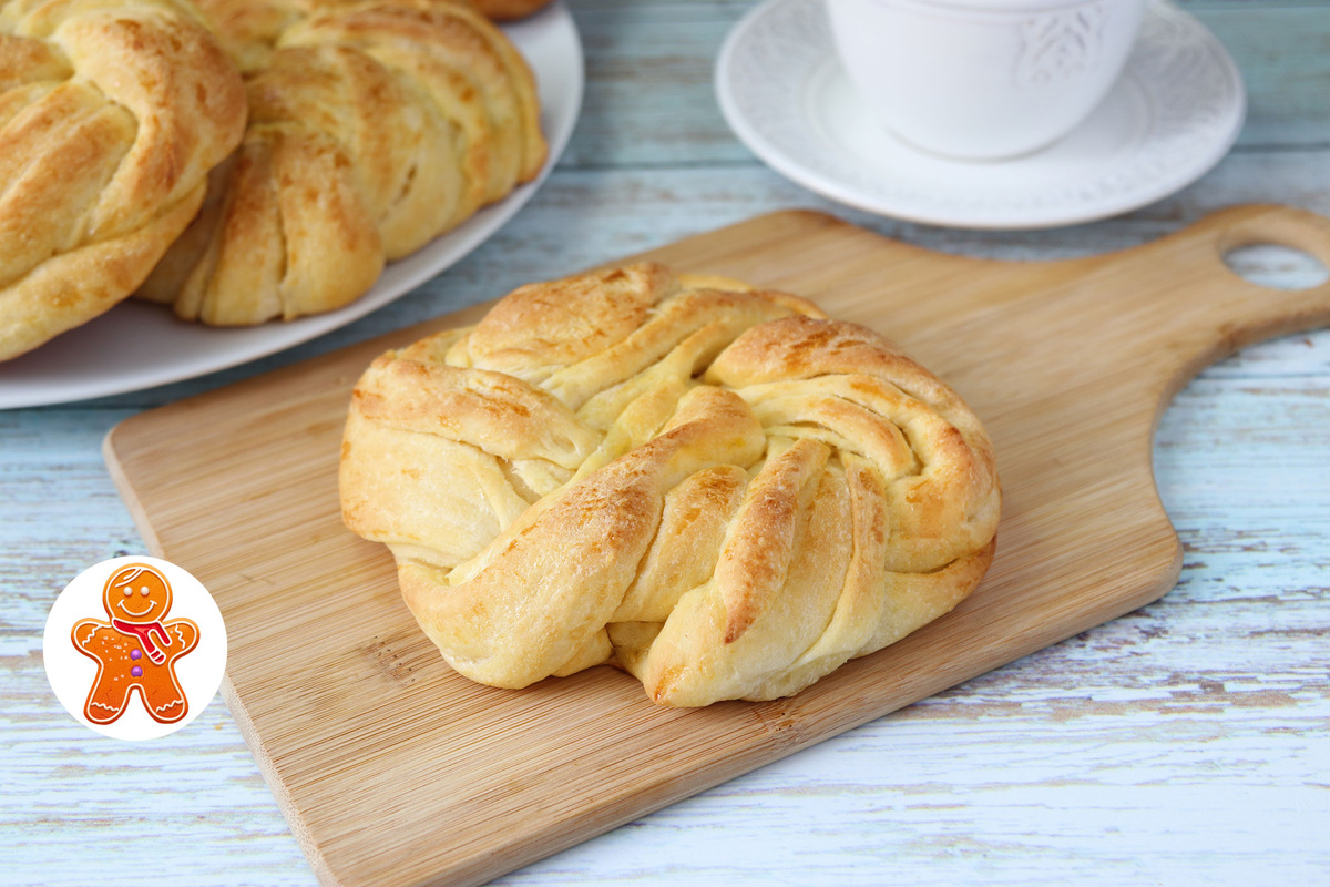 Разрезаем рулеты вдоль пополам, переплетаем и сворачиваем булочку.