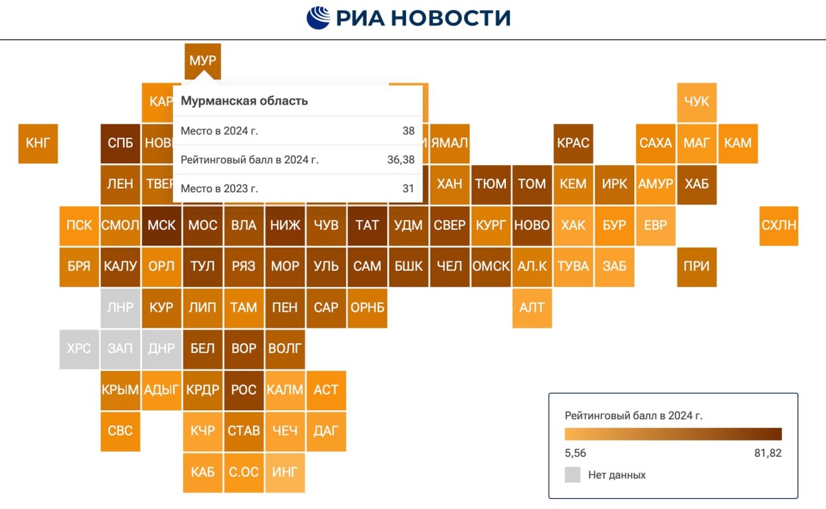 🇷🇺 Мурманская область оказалась на 38 месте рейтинга российских субъектов, составленному РИА Новости, по научно-технологическому развитию