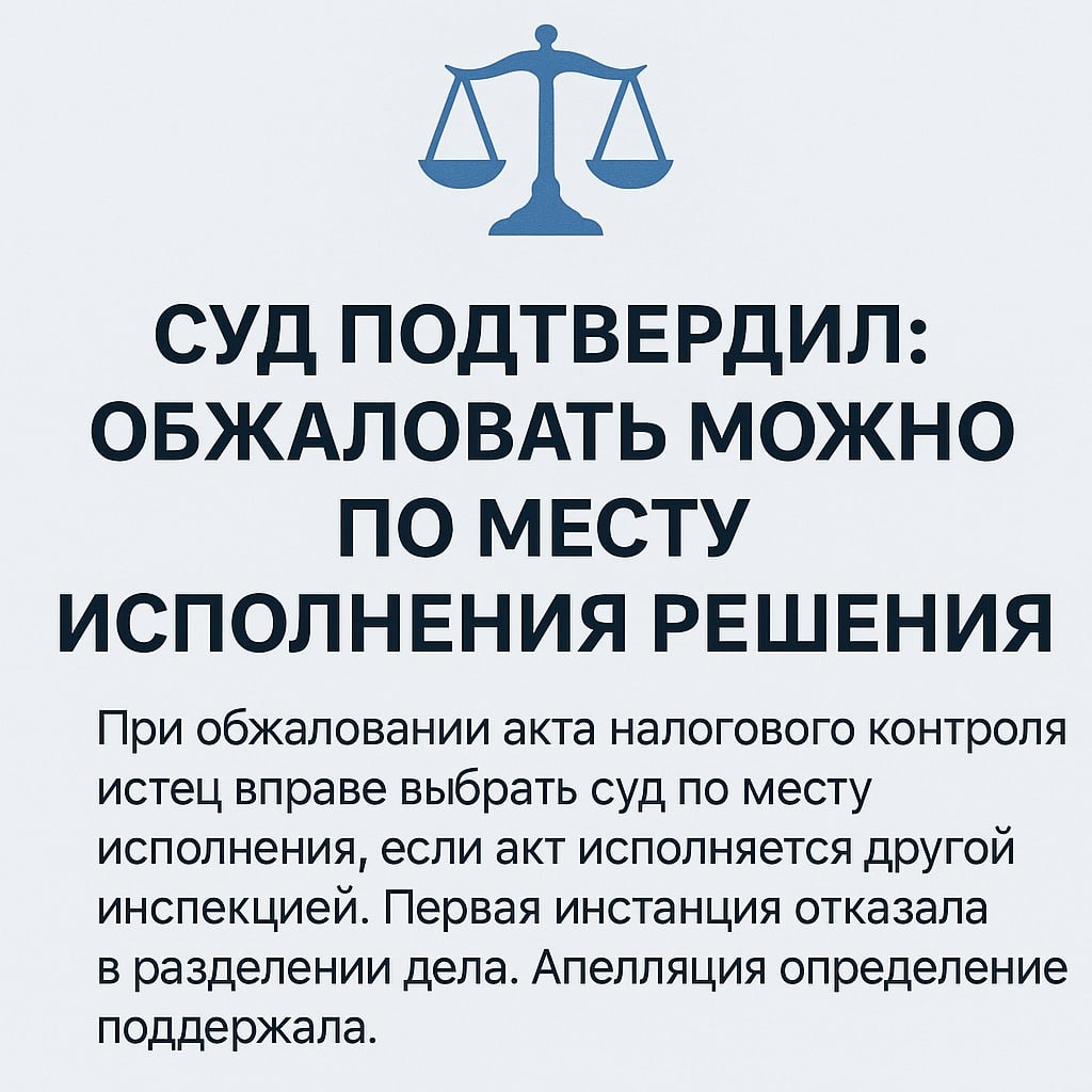 ⚖️ Где обжаловать решение налоговой, если его исполняет другая инспекция? ❓Компания решила оспорить решение налоговой о привлечении к ответственности. 🔴 Но в деле оказалось две инспекции: — одна приняла решение, — другая его исполняет по месту нахождения компании. 📍 Налоговая попыталась «разделить» дело — и отправить его в другой суд. Но суд сказал: ❌ так нельзя. 🔹 Позиция компании: Требование единое — делить его на две части невозможно. 🔹 Позиция налоговой: Ответчики из разных регионов, значит и дела должны быть разные. 🧾 Что решил суд: Разделять требования нельзя. Предмет спора — один: признать решение незаконным. А устранять нарушения должна та инспекция, которая исполняет это решение. ✅ Вывод суда: Дело рассматривается по месту исполнения решения, а не по месту его принятия. И главное — выбор суда принадлежит заявителю. 📚 Постановление Одиннадцатого арбитражного апелляционного суда от 02.10.2025 № 11АП-10168/2025 по делу № А55-14750/2025. 💡 Что это значит для бизнес