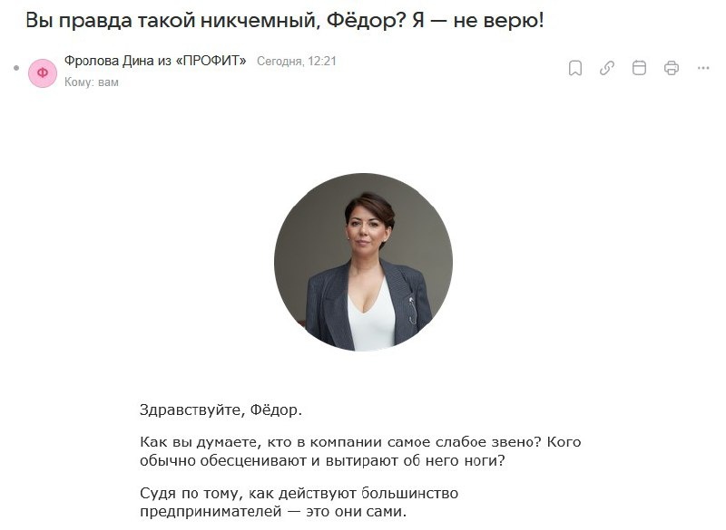 Что я думаю о такой теме? Что это — откровенная жесть. И её не извиняет даже то, что в самом письме ничего подобного нет, там всё культурно, вежливо, про то, что предпринимателям нужно себя любить и платить себе побольше денежек.