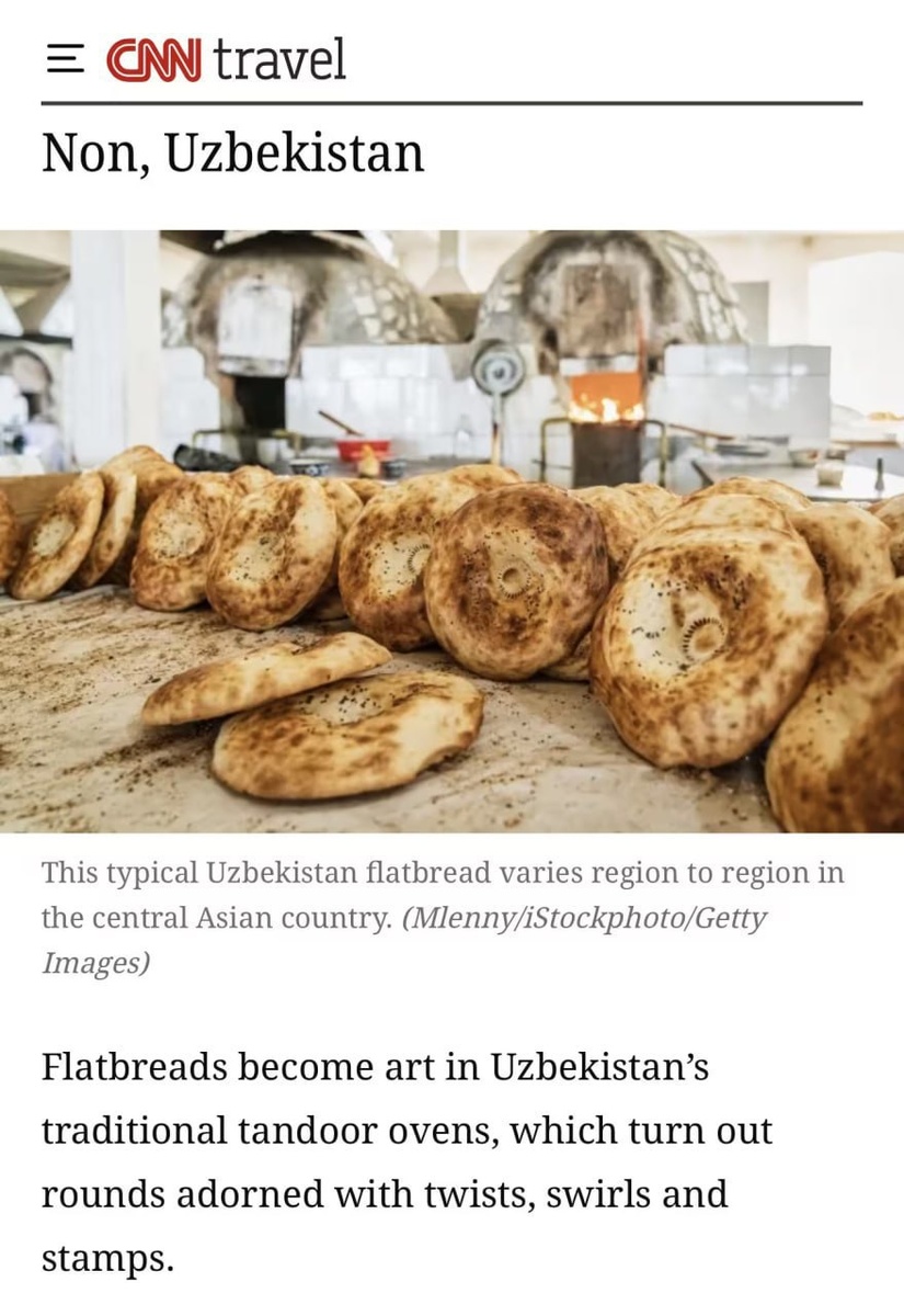 O‘zbek noni dunyoning eng yaxshi 50 xil nonlari ro‘yxatiga kiritildi “Toshkentdan Samarqandgacha har bir hududning noni o‘ziga xosligi bilan ajralib turadi”, deyiladi sayyohlar uchun ma’lumot beruvchi CNN Travel portalida. @daryolive