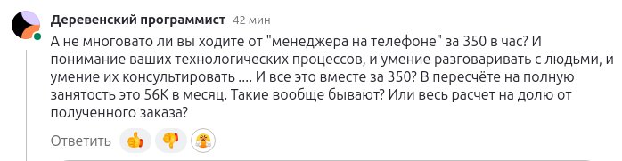 После того, как опубликовал свои соображения на тему возможного поиска помощника, получил вопрос, на который хотел бы дать подробный и развернутый ответ с позиции работодателя. Деревенский программист, это вопрос в нескольких плоскостях. 1) Что я хочу за 350 рублей в час? 2) Сколько я готов платить человеку, который будет уметь продавать и в состоянии рисовать эскизы? Сразу обозначу, что эти два пункта - два разных человека и очень разная оплата. 350 в час - это базовая оплата за ответы по скрипту. 1000 рублей предполагаю дополнительно за "закрытую сделку". Таких можно будет сделать дополнительно 10..25 в месяц. А это уже при пересчете на полную занятость куда бОльшие деньги. Вплоть до 80 т.р. в месяц при пересчете. Вы правильно пересчитали на полную занятость . Только это как раз неполная. Подработка. При том удаленная. Мне все равно, в каком регионе находится человек. А толковых людей, которые находятся где-то, где у них мало возможностей заработать больше - немало. Еще момент. Т