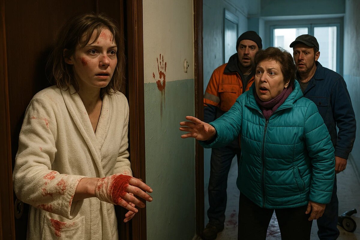 Вера — бледная, растрепанная, в окровавленном халате. Рука в бинте, красном насквозь. На лице — размазанные полосы. За спиной — лужи, отпечаток ладони на стене.