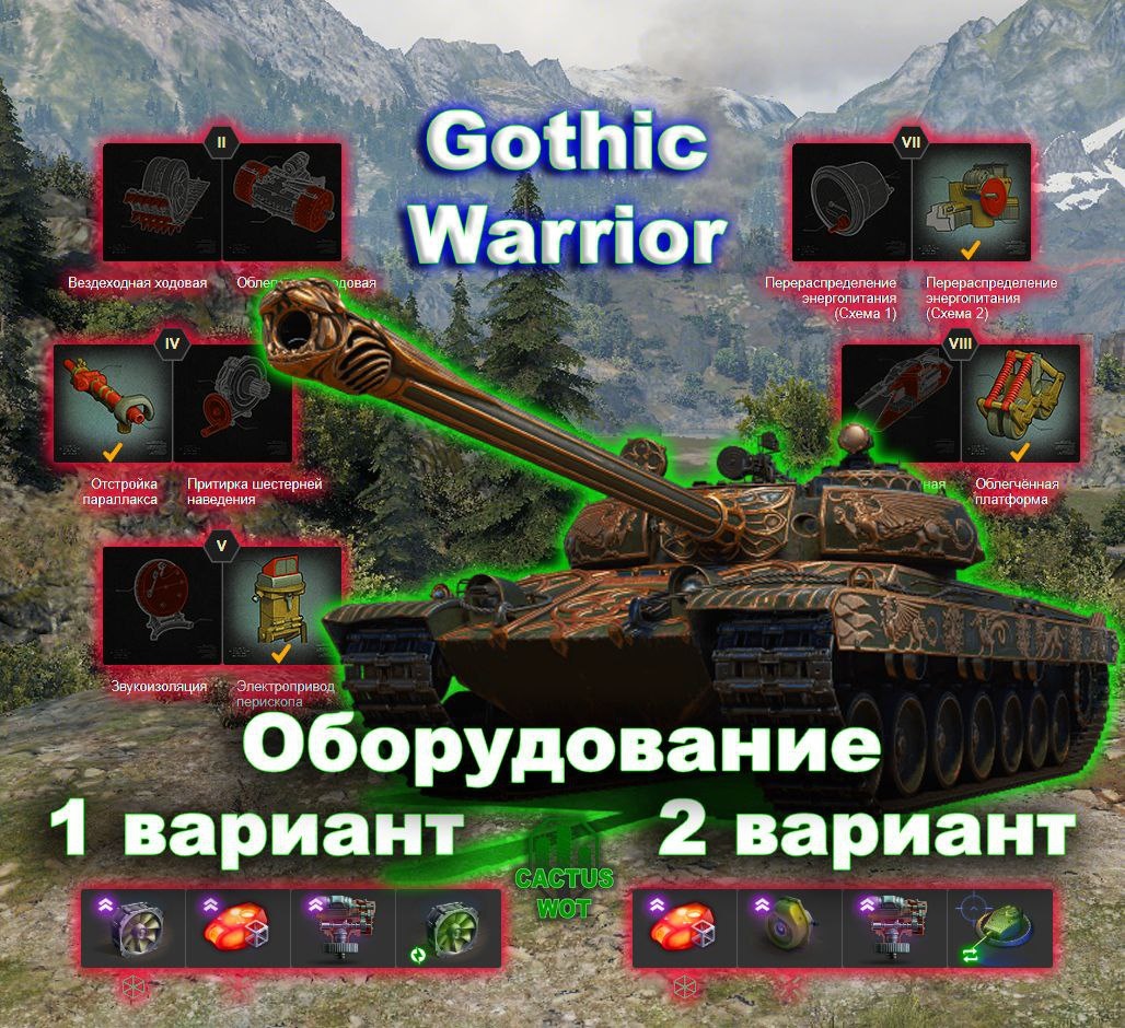 🇨🇿 Gothic Warrior 🉑Тяжелый танк прорыва 10 уровень. ⛏Оборудование и полевая модернизация на картинке 🔼 ➕Плюсы танка урон с барабана; хорошая стабилизация; механизм дозарядки. ➖Минусы танка малый запас прочности Нужно больше инфы? ⬇️⬇️⬇️⬇️⬇️⬇️⬇️⬇️⬇️ #базазнаний@CactusWOT #GothicWarrior@CactusWOT #миртанков