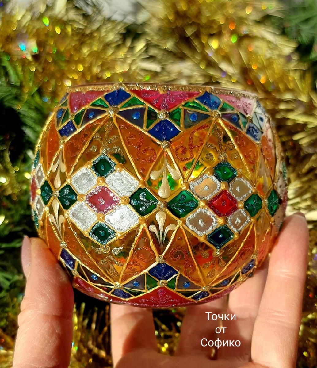 А у меня новый подсвечник. Он украшен яркой витражной росписью. Его дизайн напоминает мозаику, где разноцветные элементы соединены тонкими золотыми линиями, создающими эффект изысканности и роскоши. Основные цвета — насыщенный малиновый, зеленый, синий и золотой, которые придают изделию праздничный и торжественный вид. Форма подсвечника округлая, что делает его удобным для размещения свечи. Такой подсвечник станет отличным украшением интерьера, особенно в зимний период или на праздники. Он может использоваться как самостоятельный элемент декора или в композиции с другими подсвечниками. Подсвечник уже нашел свою хозяйку)) По всем вопросам в лс #новогоднийподарок #подарокшефу #новогоднийдекор #точкиотсофико