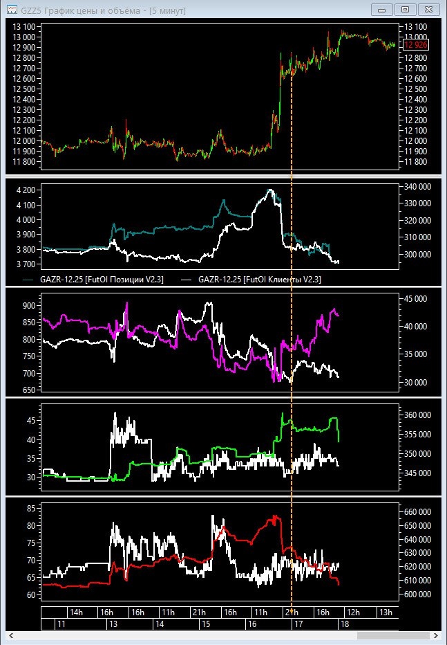 Газпром. В пятницу и в выходные ничего нового – продолжился слабый рост, как и предполагалось, и узкий флет в выходные. В воскресенье продажи усилились за счет активных ордеров, но их сдержали лимитными покупками. Объём в выходные традиционно очень низкий, так что сделать это, видимо, было не сложно. РОИ в пятницу показывает набор шортов относительно крупным юриком, в остальном идет или небольшой сброс поз или сохранение. В выходные, судя по суммарному ОИ, значительных изменений не было. В выходные в новостях появились обсуждения о поддержке Трампом позиции России, но вряд ли они способным повлиять позитивно на наш рыночек. Т.о., при сохранении сегодня того же настроения, думаю, с большей вероятностью стоит ожидать снижения цены.