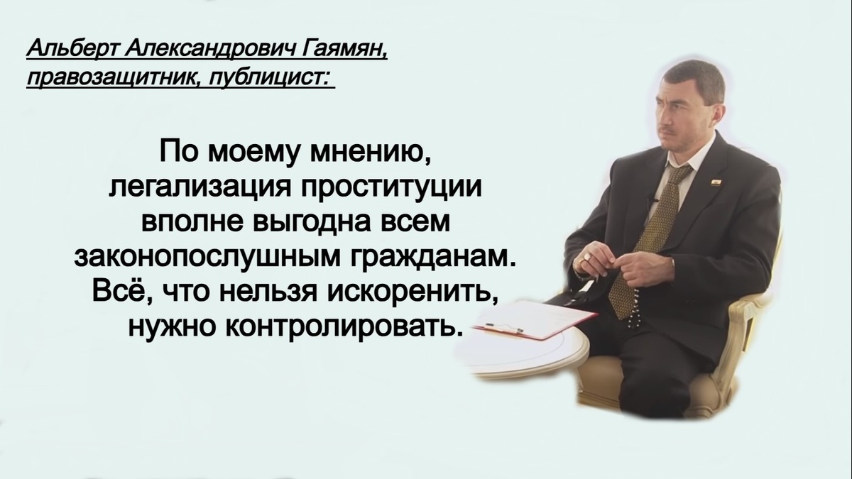 Первое! В России многотриллионный дефицит государственного бюджета. В конкретные цифры я сейчас вдаваться не буду, недостача финансов существенная… Второе! В РФ, при полном запрете проституции, не покладая рук и ног, в горячем поту, используя все свои отверстия, в одиночку и группами трудятся жрицы продажной любви, сосчитать которых практически невозможно. По разным подсчётам их в стране от трёх до пяти миллионов. Цена за ночь с проституткой доходит до двухсот тысяч рублей! Это — заплата опытного педагога при полной нагрузке за несколько месяцев! Третье! В Российской империи на протяжении почти девяти десятилетий проституция была легальной — под строгим полицейским и медицинским контролем. В стране действовало две тысячи четыреста публичных домов. В общем, опыт имеется, и он положительный! Четвёртое! Легализация проституции в РФ поможет существенно сократить дефицит государственного бюджета. Жрицы продажной любви, добросовестно оплачивая налоги и пошлины, в столь непростой экономическо