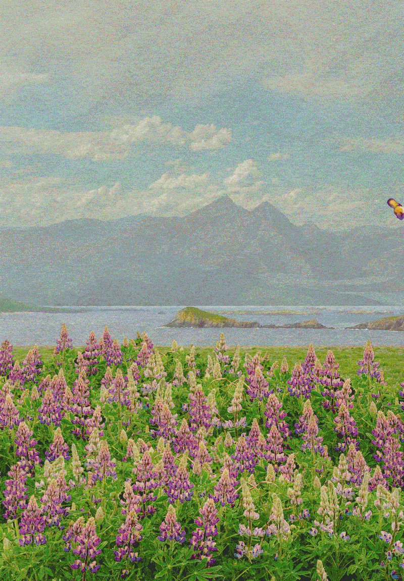 Перед ним луг каскадом спускался к морю волнами цвета настолько пронзительного, что казалось, он украден из чьей-то чужой памяти — уж точно не из его, где всё давно окрасилось серым. Люпины. Тысячи люпинов, их фиолетовые и лиловые шпили качались, словно прихожане во время молитвы. За ними вода лежала неподвижная, как кованая сталь, а маленькие острова покоились на её поверхности с бесконечным терпением спящих левиафанов. Горы стояли на своих древних постах, их вершины смягчали облака, обещавшие дождь, но дарившие лишь безмолвное присутствие.