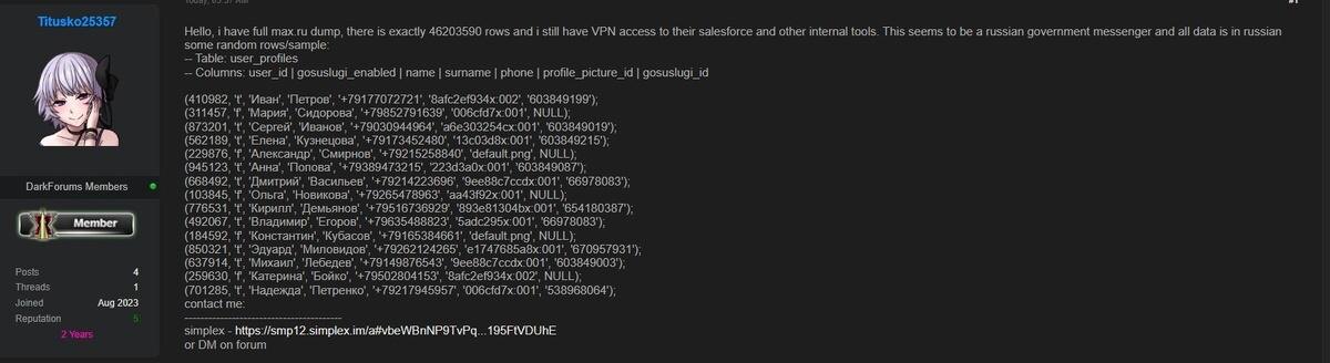 Публикации о взломе базы данных мессенджера Max сфабрикованы, заявили в Минцифры Данные пользователей надежно защищены, утверждают там Автором информации об утечке был выложен сэмпл, содержащий 15 записей, в которых были указаны якобы ID пользователей Госуслуг. Проверка показала, что ни по одной из опубликованных записей ID Госуслуг не совпадает с ФИО реальных пользователей В самом мессенджере также категорически опровергают информацию об утечке Информация не соответствует действительности. Это фейк, распространяемый анонимными источниками Сегодня пользователь даркнет-форума DarkForums сообщил, что получил «полный дамп» базы мессенджера Max объемом больше 46 млн строк По его утверждению, в них содержатся имена пользователей, телефоны и даже информация о том, привязан ли профиль к «Госуслугам» Автор также заявил, что у него есть доступ к внутренним системам компании-разработчика и в доказательство выложил несколько строк с данными пользователей --- Центр безопасности мессенджер