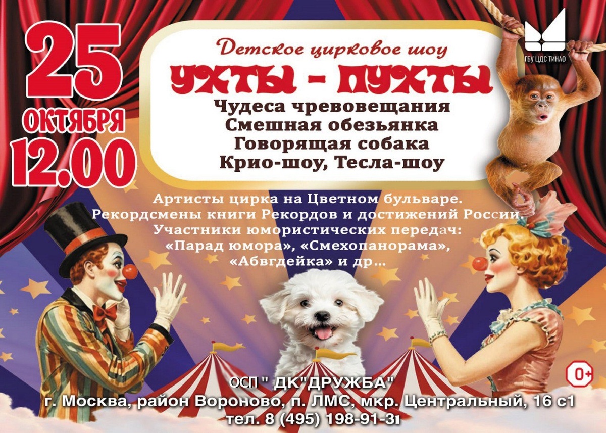 Волшебное шоу «Ухты-Пухты» приглашает детей и родителей! Что Вас ждёт: 🎤 Уникальный номер! Говорящая собачка Джеки 🐶 (артисты разговаривают, не открывая рта! Это называется чревовещание - очень редкое искусство😉) 🤡 Весёлые клоуны и озорная обезьянка ⚡ Шоу с молниями - красиво и не страшно! (Тесла Шоу) ❄️ Ледяное волшебство - удивительные эксперименты с азотом (Крио Шоу) Не только супер зрелищно, но ещё и очень познавательно! Вы сможете поиграть с артистами и даже сами стать участниками представления! Будет очень весело и интересно и детям, и родителям🎭🎉 «Ухты-Пухты!» - ждём Вас на нашем представлении!📢🎪🥳👏 Билеты на сайте: https://iframeab-pre4796.intickets.ru/seance/66851631/#abiframe #новостивороново #анонсывороново #новоститинао #анонсытинао