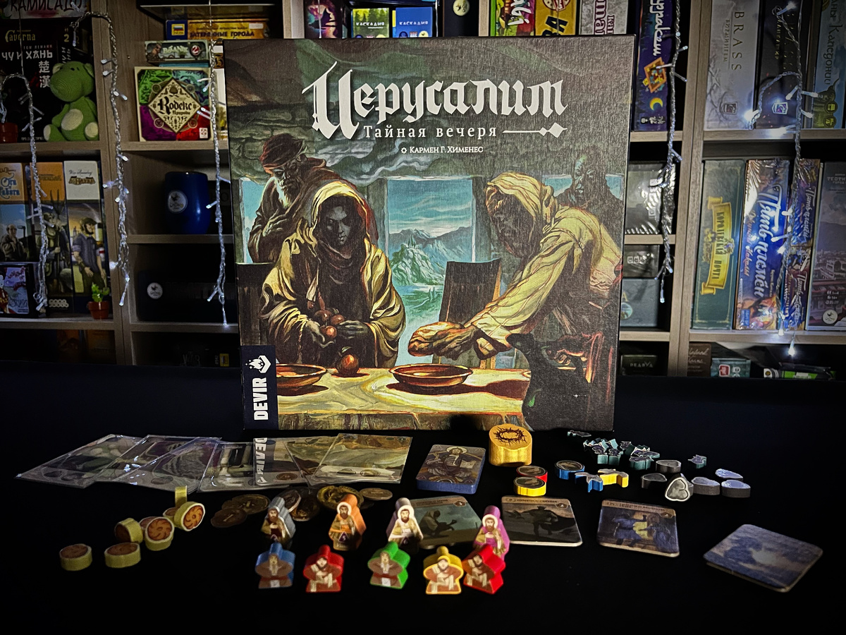 Конечно, я не сказала о многих других игровых нюансах, о которых лучше узнать в процессе игры, но, как мне кажется, здесь важнее мысли и эмоции, которые возникают во время партии. «Иерусалим» раскрывается неожиданно, и не на этапе чтения правил или подготовки, а в момент, когда ты понимаешь, какая нешуточная борьба разыгрывается за места «под солнцем». Не знаю, можно ли назвать эту тематику миролюбивой, учитывая все события, происходящие после самой Тайной вечери, но вы не ожидаете, что последователи будут так яростно бороться за возможность находиться возле Иисуса и его апостолов. Как они будут расталкивать друг друга и отправлять на задворки, лишь бы увидеть божественное сияние.