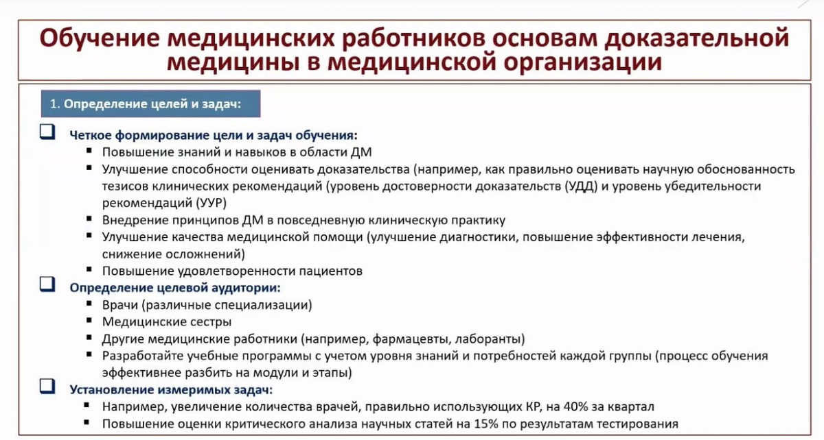 “Часто руководители медицинских организаций, которые отвечают за обучение, не учитывают стартовый уровень знаний сотрудников и формируют обучающие программы, не распределяя их по малым группам в зависимости от этого уровня. На рынке нет полностью готовых программных решений по выполнению требований доказательной медицины и одновременно обучению медицинских работников,с подтверждением проведения обучения и контроля его эффективности. Это означает, что необходимо разрабатывать их самостоятельно и постоянно информировать врачей об изменениях”, - перечислила эксперт.