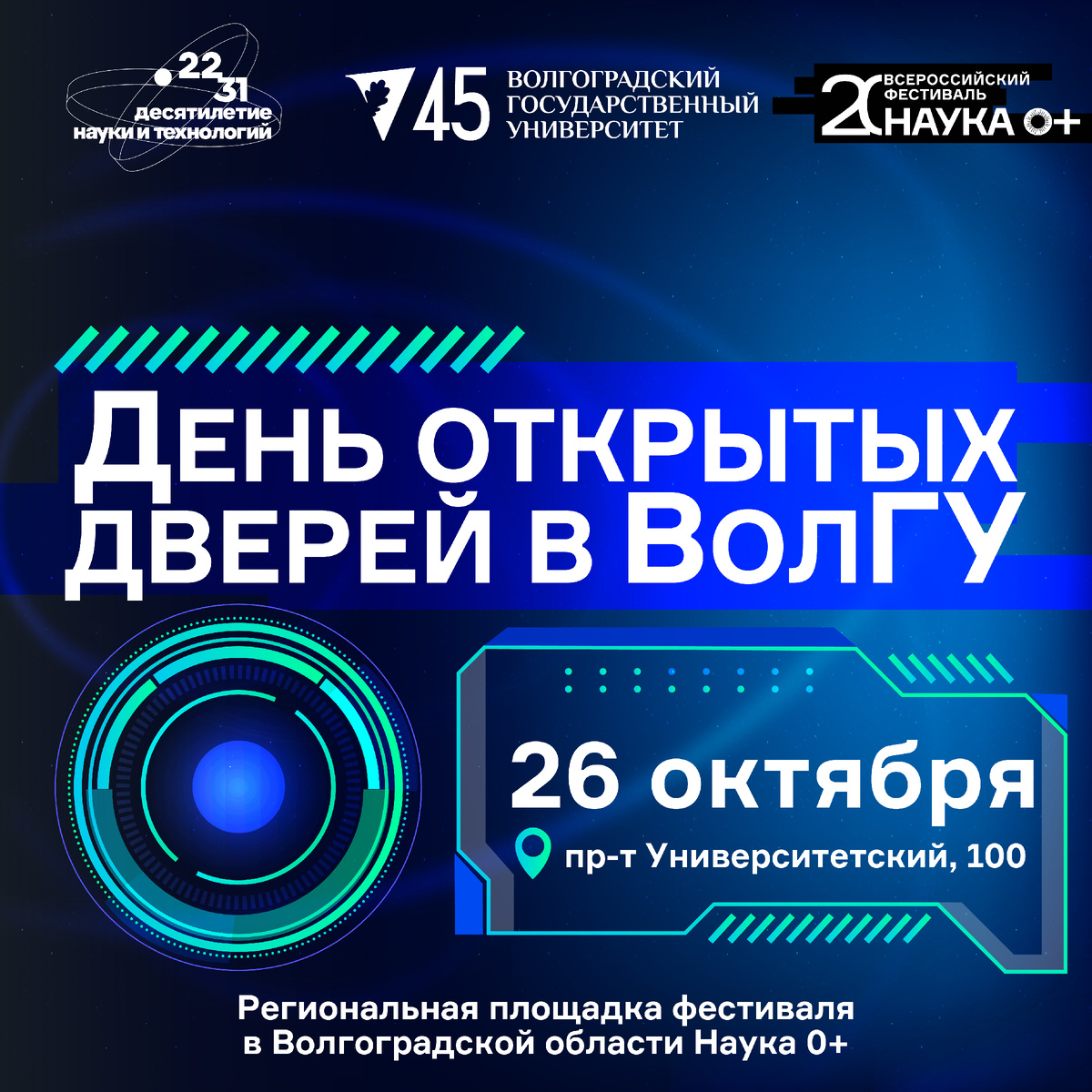 26 октября с 10:00 ждем абитуриентов и родителей в ВолГУ. В этот день узнаете: 1️⃣ Как за год набрать дополнительные баллы для поступления в ВолГУ и какие существуют льготы? 2️⃣ Какие направления подготовки есть в ВолГУ по программам высшего образования? 3️⃣ Как поступить в Университетский колледж ВолГУ? В главном корпусе А на проспекте Университетский, 100 и в здании Научной библиотеки (корпус М) пройдут встречи всех институтов и Университетского колледжа ВолГУ, будут работать тематические интерактивные площадки Всероссийского фестиваля Наука 0+: 💛 В 11:00 в ауд. 4-29Г — встреча института математики и информационных технологий С 10:00 — интерактивная площадка в холле 3 этажа корпуса А 🧡 В 11:00 в ауд. 4-04А — встреча института филологии и межкультурной коммуникации С 10:00 — интерактивная площадка в холле 4 этажа корпуса А (около 4-04А) 💎 В 11:00 в ауд. 2-14Б — встреча института истории, международных отношений и социальных технологий С 10:00 — интерактивная площадка в холле 2 эт
