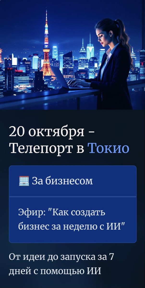 Интервью. Фрагмент. — Вы были на той самой лекции? — Да. В первом ряду. — Что Вы почувствовали? — Честно? Сначала — скепсис. Ну правда, «создать бизнес за неделю» — звучит как маркетинговый заголовок. Но прошло минут пять. И она вывела первый слайд. — ИИ — как партнёр. Структура — как фундамент. 7 дней — как лимит, а не ограничение. И всё. В зале наступила тишина. Потому что каждый начал видеть, как это работает. Не теория. Не «поверить в себя». А чёткий план. — И это было реально? — Не просто реально. Это заразительно. После лекции никто из зала не вышел. Люди остались. Чтобы начать. ⸻ И вот теперь — впервые: 📍 В 19:00 — телепорт в Токио 🗼 Открытая трансляция той самой лекции. Как создать бизнес за неделю с ИИ — без команды, без бюджета, без воды. Если Вы всё ещё «собираетесь с мыслями» — включите эфир. Возможно, потом Вы тоже скажете: «Да, я был(а) на той самой лекции. И с этого всё началось.» ⬇️⬇️⬇️ Ссылка на эфир