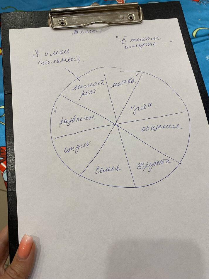 И показала колесо баланса жизненных сфер. Вот такие темы бывают. Любовь, развитие, учеба, дружба и тд