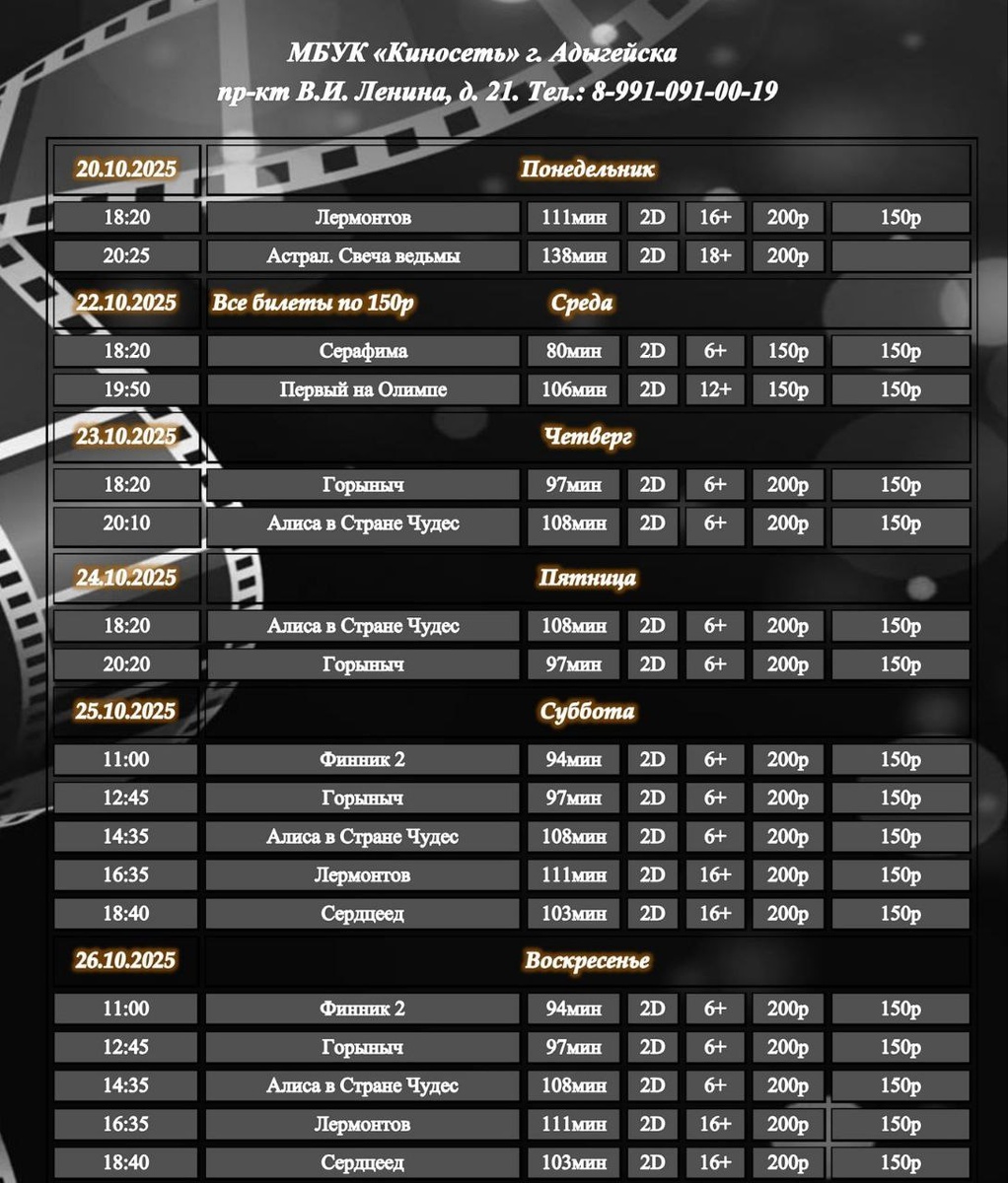 Расписание Кинозала г. Адыгейска с 20.10.2025 по 26.10.2025🎞 Купить билет онлайн можно по ссылке внизу 👇 https://clck.ru/32VTgE ___ Мы в социальных сетях👇 VK 🎞https://clck.ru/34TuU5 TG 🎞https://clck.ru/34TuU6 ОК 🎞https://clck.ru/3MdGRj 🎞WhatsApp: 8-991-091-00-19 📱8-991-091-00-19