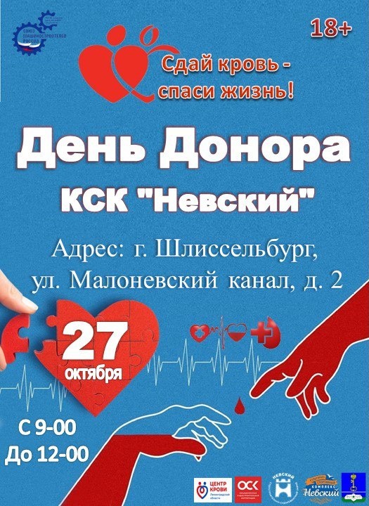 Сдай кровь - спаси жизнь! 27 октября 2025 года приглашаем всех желающих старше 18 лет, не имеющих противопоказаний к донации, принять участие в акции «День Донора». Адрес: Шлиссельбург, ул. Малоневский канал, дом 2, КСК «Невский» Время: с 9-00 до 12-00 При себе иметь: паспорт, полис и СНИЛС. Меры социальной поддержки для доноров: ✅ справка на 2 дня отдыха ✅ компенсационная выплата на питание 1634 руб «День Донора» организован предприятием ОСК «Невский ССЗ» (базовое предприятие Ленинградского РО СоюзМаш России) совместно при поддержке Администрации МО г. Шлиссельбург и КСК «Невский». Возможны ограничения по забору крови, следите за нашими объявлениями! #ОСК #НевскийССЗ