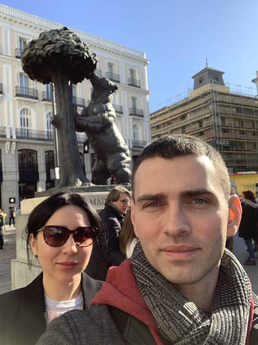 Основные достопримечательности Мадрида нами были изучены во время прошлых поездок в Испанию и мы обязательно сделаем про них отдельную статью. В этой статье предлагаем вашему вниманию факультативную программу. Начнём наше путешествие с самого центра испанской столицы — площади Plaza del Sol. Эта овальная площадь является символом Мадрида и служит отправной точкой многих городских маршрутов. Именно отсюда начинается отсчёт всех автомобильных дорог Испании, что подчёркивает её особое значение. Окружённая величественными зданиями XVIII века, площадь привлекает туристов своей уникальной атмосферой и историческим шармом. На площади также установлена скульптура «Медведь и земляничное дерево», которые в свою очередь являются символами Мадрида. Композиция медведя и дерева впервые появилась на гербе в XIII веке, а скульптура на площади в 1967 году. Есть несколько версий происхождения этого символа: 1) разделение сфер влияния государства и церкви (охотничьи угодья были у государства, сельхозу