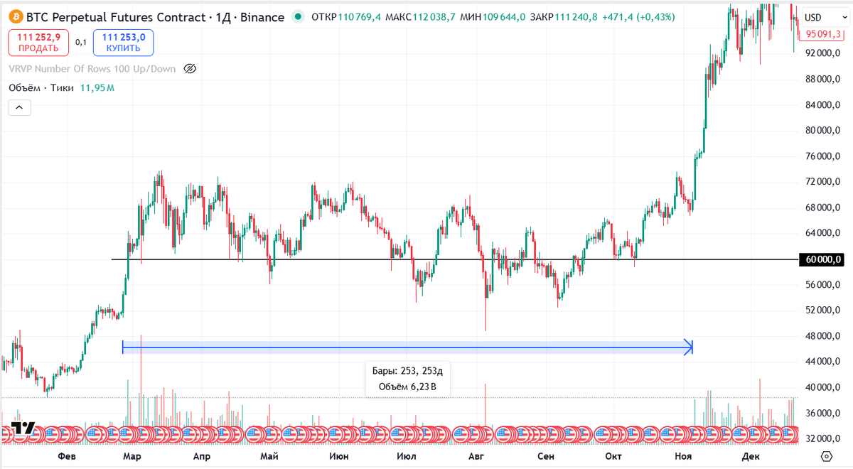 Π ΠΈΡ. 1. Π¦Π΅Π½Π° BTC 263 Π΄Π½Ρ ΠΊΠΎΠ»Π΅Π±Π°Π»Π°ΡΡ Π½Π° ΡΡΠΎΠ²Π½Π΅ 60 ΡΡΡΡΡ, Π΄Π΅ΡΠΆΠ° ΡΠΎΠ»ΠΏΡ Π² Π½Π°ΠΏΡΡΠΆΠ΅Π½ΠΈΠΈ, ΠΏΠΎΠΊΠ° Π½Π΅ ΠΎΠΏΡΠ΅Π΄Π΅Π»ΠΈΠ»Π°ΡΡ Ρ Π½Π°ΠΏΡΠ°Π²Π»Π΅Π½ΠΈΠ΅ΠΌ ΠΈ Π½Π΅ ΠΏΠΎΡΠ»Π° Π²Π²Π΅ΡΡ .