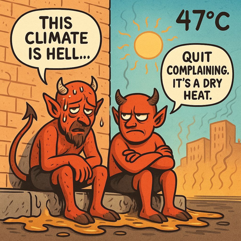 Возвращаюсь я, значит, с магазина. Всё плывёт, асфальт плавится, воздух будто кисель — горячий, липкий, не продохнуть 🍲🔥. На углу дома — сидят два черта 😈😈. Да-да, прям натуральных: рожки, копытца, хвосты и грустные-прегрустные рожи 😓. Подхожу. — Э, вы чего тут? Один, вялый такой, отвечает: — Да вот… накосячили мы в аду. Перевернули котёл, грешники разбежались кто куда. У Люцифера пиво стащили 🍺. Нас в наказание в Ташкент отправили. На 40 дней. В чиллю, понимаешь? Второй кивает: — Жарко, братан. У нас в аду, между прочим, кондиционер есть 🧊. А тут… пекло, асфальт плавится, люди на асфальте яичницу жарят 🍳, голуби как куры гриль 🕊️🔥. — Очень страшное наказание… — шепчет первый и вытирает копытом пот со лба 🐐💦. Я хотел им воды дать… И тут… Я просыпаюсь 😵. На часах 15:00 — самое пекло 🕒🌞. Телефон показывает +47° 📱🥵. Кондиционер не работает. Свет вырубили ⚡. Я выглядываю в окно — на углу дома кто-то машет хвостом… 👀🐉 --- Подписывайся на канал, чтобы не пропусти