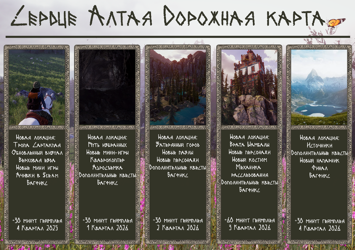 Мы запланировали 5 больших обновлений для нашего проекта "Сердце Алтая", и в каждом вас ждут: Геймплея станет больше, а приключения ещё интереснее. Первый апдейт уже не за горами! А вы готовы отправиться в новое путешествие по Алтаю? Проект уже доступен в раннем доступе на платформах Steam и VK Play. Не забывайте подписываться на наши каналы в социальных сетях. Впереди много интересных новостей!