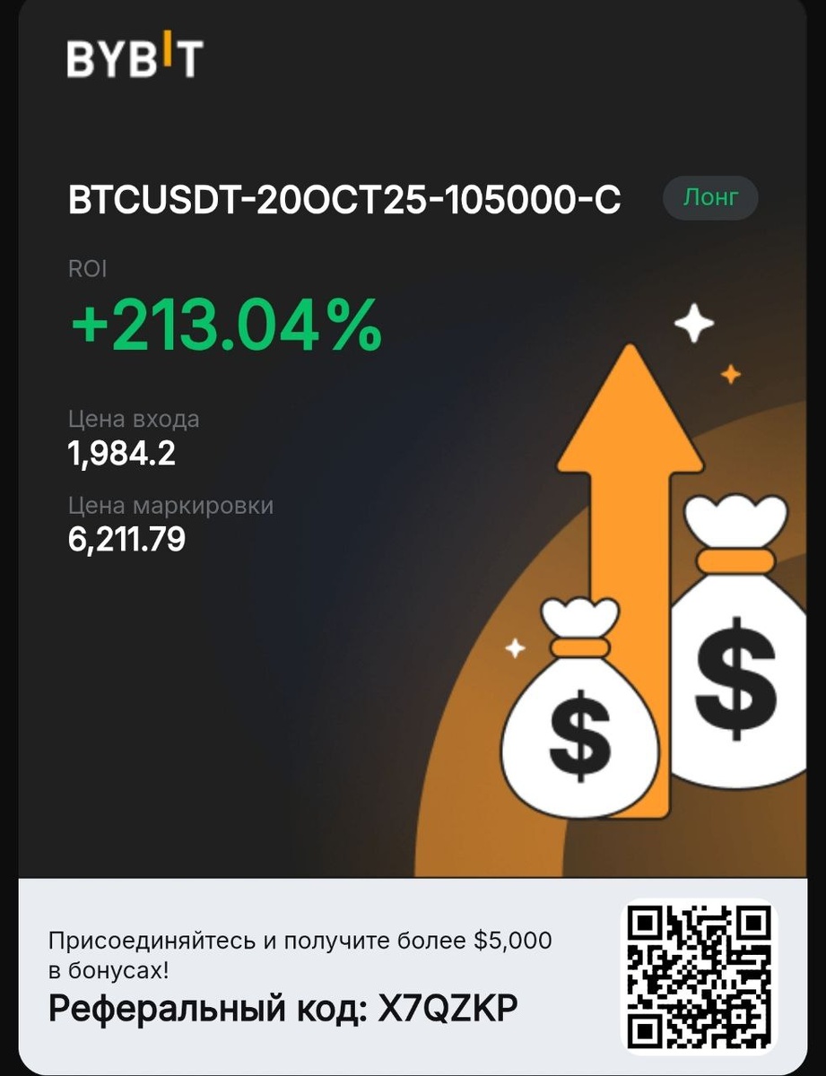💥 Результат отработки по Биткойну Это результат того самого сценария, о котором я писал выше. 📈 Опционы позволяют открывать позиции с ограниченным риском, но с неограниченной прибылью — и, что особенно приятно, по стопу вас не выбьет. Что ещё нужно? 😉 Последнее время я писал о Биткойне немного — просто не было причин. А трейдинг без причины, сами знаете, — это диагноз. Но причина появилась, и есть результат. Главное — вовремя уловить момент, когда эта причина возникает. Если кто-то думает о пробе пера на криптовалютном рынке, советую обратить внимание на Bybit — на недавнем краше даже Binance подвис, а Bybit отработал стабильно и без сбоев💪. Да и в части санкций политика биржи пока не вызывает опасений. 👉 Воспользуйтесь реферальной программой — https://bybit.com/ru-RU/invite?ref=X7QZKP — это плюс и для вас, и для меня 😉