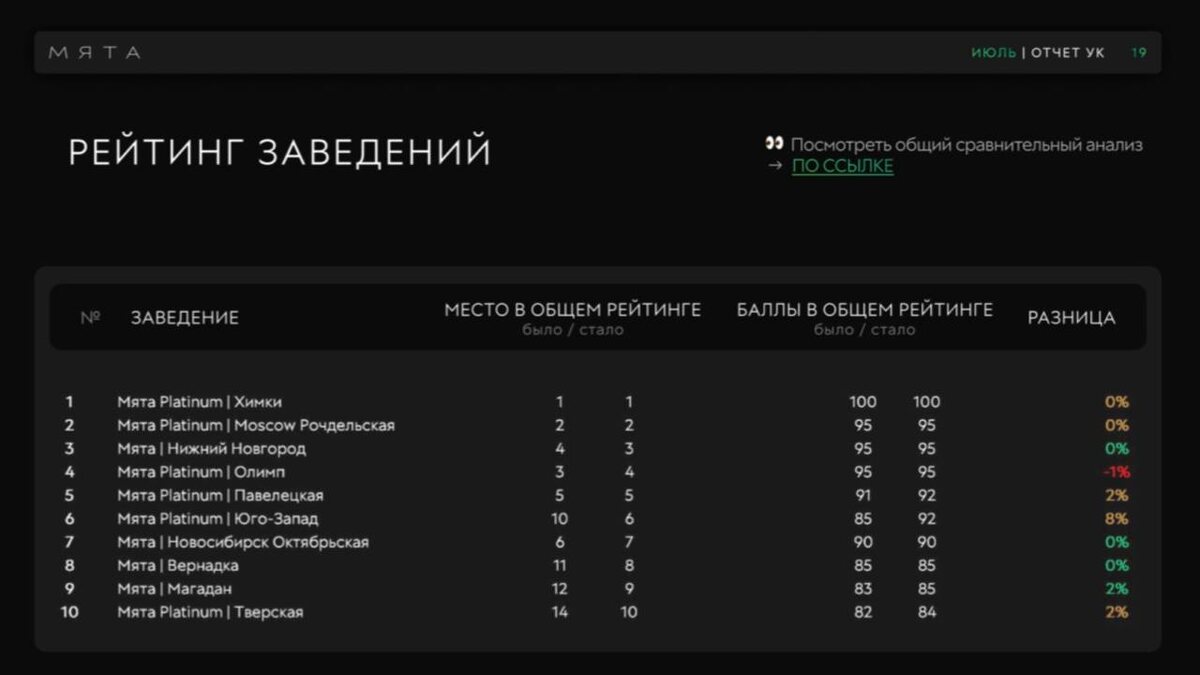 Управление масштабной франчайзинговой сетью, объединяющей сотни предпринимателей, - это не только вопрос стандартов и поддержки, но и выстраивание эффективной системы мотивации и обратной связи. Как управлять таким количеством партнеров? Как оценивать всех объективно? Как мотивировать развиваться? Управление масштабной франчайзинговой сетью, объединяющей сотни предпринимателей, — это не только вопрос стандартов и поддержки, но и выстраивание эффективной системы мотивации и обратной связи. Эффективность заведений сети Мята отражается во внутреннем ежемесячном рейтинге партнеров. Баллы начисляются по различным критериям: от выручки заведений до рейтингов на геосервисах. Такой комплексный подход позволяет получить сбалансированную картину, где учитываются и не только финансовые показатели, но и удовлетворенность гостей. Но мы не только «спрашиваем» с франчайзи, но и развиваемся благодаря внутреннему рейтингу сети и сами. По итогам рейтинга каждый год УК формирует Мятную лигу — топ заведен
