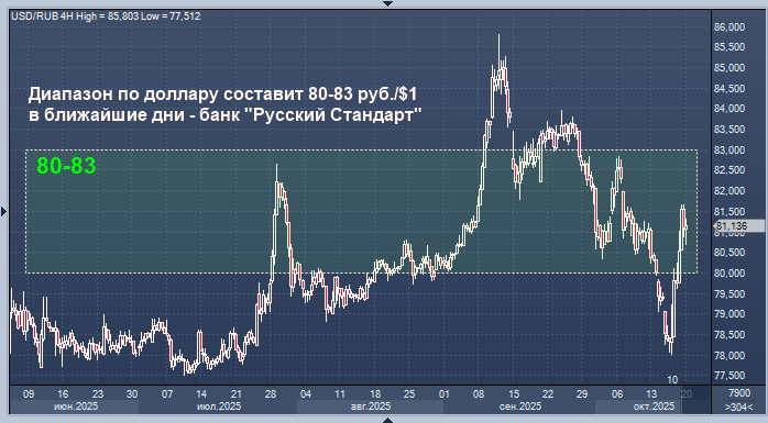 Торговый диапазон по доллару составит 80-83 руб./$1 в ближайшие дни - банк "Русский Стандарт" Курс доллара к рублю расчётный, фьючерс, вечный фьючерс и межбанк. Курс евро к рублю расчётный, фьючерс, вечный фьючерс и межбанк. Курс юаня к рублю биржевой, фьючерс, вечный фьючерс и межбанк. Торговый диапазон по паре доллару, скорее всего, составит в ближайшие дни 80-83 руб./$1, по евро - 94-97 руб./EUR1, говорится в комментарии директора департамента операций на финансовых рынках банка "Русский Стандарт" Максима Тимошенко. На взгляд эксперта, добавляют оптимизма рынку данные по годовой инфляции в РФ, которая в сентябре показала замедление до 7,98%. В фокусе на неделе - решение по ключевой ставке, которое, в случае ее незначительного снижения и сохранения жесткого сигнала регулятора, сохранит высокие рублевые ставки как фактор поддержки рубля, полагает Тимошенко. "Однако приоритетным для дальнейшей траектории его движения по-прежнему остается экспортно-импортный баланс, - подчеркивает он. -