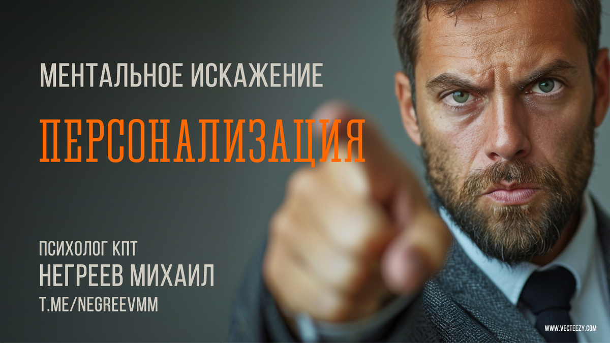 Персонализация — это искажение интерпретации, при котором человек склонен брать на себя чрезмерную ответственность за события, которые на самом деле зависят от него лишь частично или совершенно не зависят. Такая форма мышления активно способствует низкой самооценке, чувству вины, тревожности и депрессии. Ключевые характеристики 1. Приписывание себе причинности: «Это произошло из-за меня». 2. Игнорирование других факторов: человек не учитывает роль других людей, обстоятельств, случайности. 3. Чрезмерная ответственность: чувство, что вы должны были все контролировать и предотвратить. 4. Эгоцентризм в негативном ключе: убежденность, что вы являетесь центральной причиной неудач или плохого настроения других людей. Как проявляется? Примеры из жизни Пример 1: Социальные взаимодействия · Ситуация: Вы звоните другу, он отвечает сухо и говорит, что занят. · Мысль при персонализации: «Наверное, я его чем-то обидел(а)», «Он злится на меня», «Я ему надоел(а)». · Более вероятные причины: У друга б