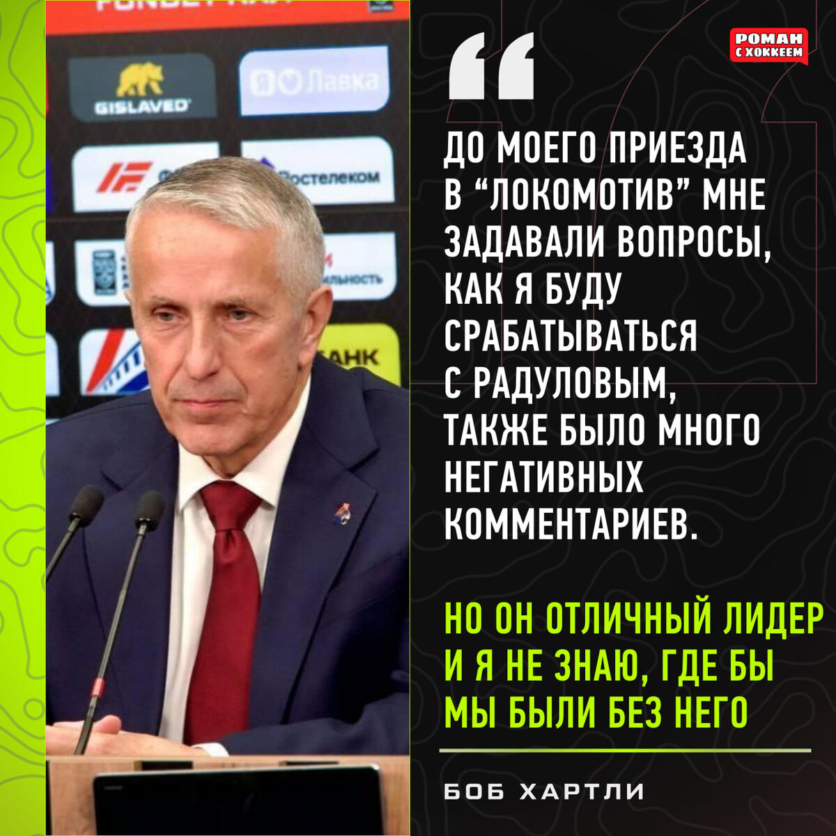 Боб Хартли сказал про Александра Радулова на послематчевой пресс-конференции: "До моего приезда в "Локомотив" мне задавали вопросы, как я буду срабатываться с Радуловым, также было много негативных комментариев. Но он отличный лидер и я не знаю, где бы мы были без него"